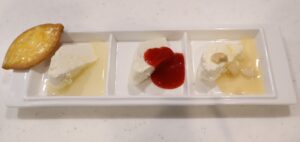 お家でも簡単にリコッタチーズができます。おつまみ&デザートにもアレンジ可能です。どのようにアレンジするか考案中です。リコッタチーズで、できたホエーは今回のお料理にも使用していきます。3種のソースと共に召し上がっていただきました。