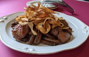フランスの郷土料理をオリエンタルな味わいにアレンジ。鶏肉とごぼうの和テイストの煮込み、ごぼうのしっとり、カリカリ食感、両方を楽しめます。ワインのおつまみにも、ご飯にも合う一品。冊子に掲載されたお料理。